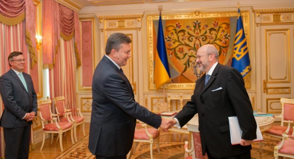 OSCE Secretary General Lamberto Zannier (r) meets Ukrainian President Viktor Yanukovych, as the OSCE Chairperson-in-Office, Ukrainian Foreign Minister Leonid Kozhara, looks on, Kyiv, 11 June 2013. (Presidential Administration of Ukraine) Photo details