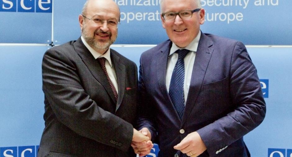 OSCE Secretary General Lamberto Zannier greets Dutch Foreign Minister Frans Timmermans, Vienna, 1 July 2013. (OSCE/Jonathan Perfect) Photo details