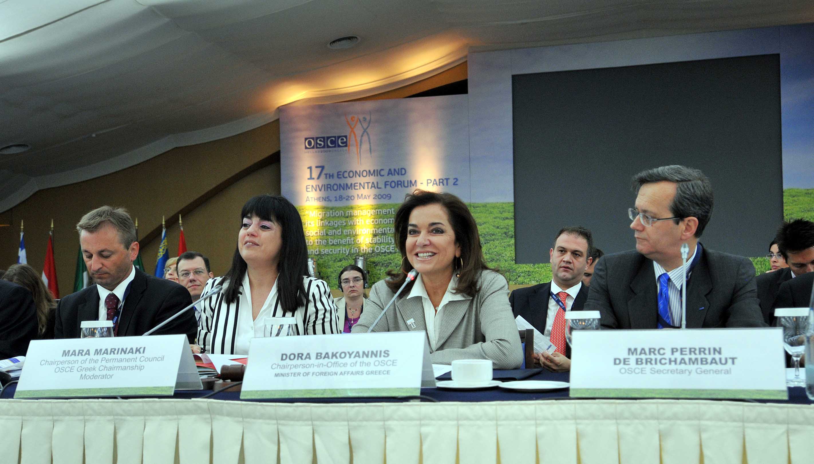 OSCE Chairperson-in-Office, Greek Foreign Minister Dora Bakoyannis (c); OSCE Secretary General Marc Perrin de Brichambaut (r) and Permanent Council Chairperson Mara Marinaki (l) at the 17th Economic and Environmental Forum Part 2, Athens, 18 May 2009.