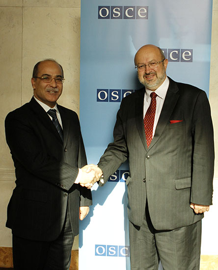 H.E. Ambassador Hussam Abdullah Ghodayeh Al Husseini (l), Kingdom of Jordan, and the OSCE Secretary General Lamberto Zannier, Vienna, 4 October 2013.