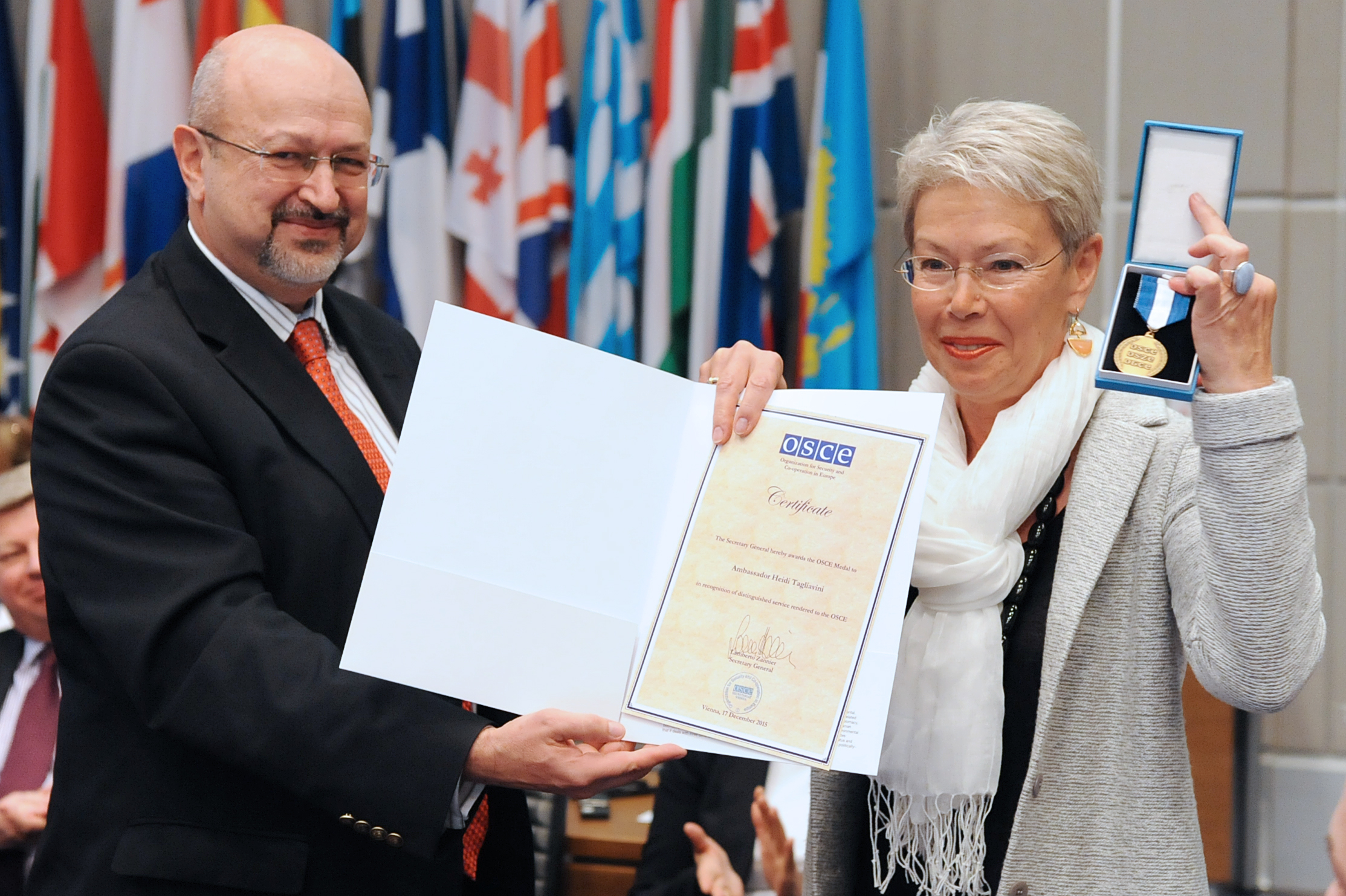 OSCE Secretary General Lamberto Zannier awarding Ambassador Heidi Tagliavini with the OSCE Medal for her dedication and tireless efforts that embody the OSCE’s lasting contribution to international security and co-operation, Vienna, 17 December 2015.