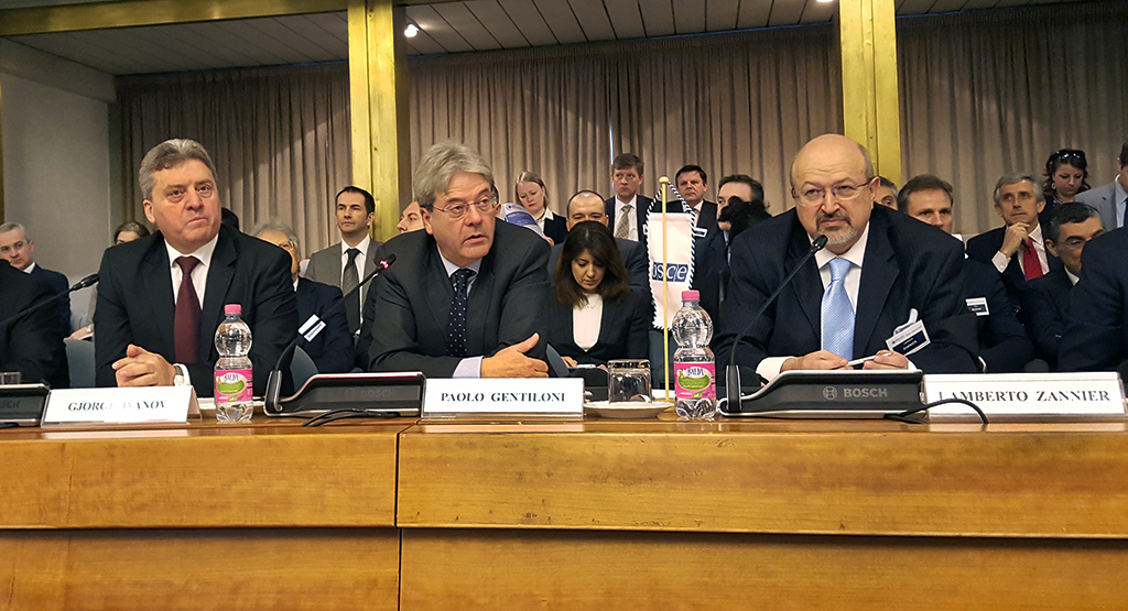 (L-r) Gjorge Ivanov, President of the former Yugoslav Republic of Macedonia, Italian Minister of Foreign Affairs and International Co-operation, Paolo Gentiloni and OSCE Secretary General Lamberto Zannier at the OSCE Security Days event on migration and security, Rome, 4 March 2016.