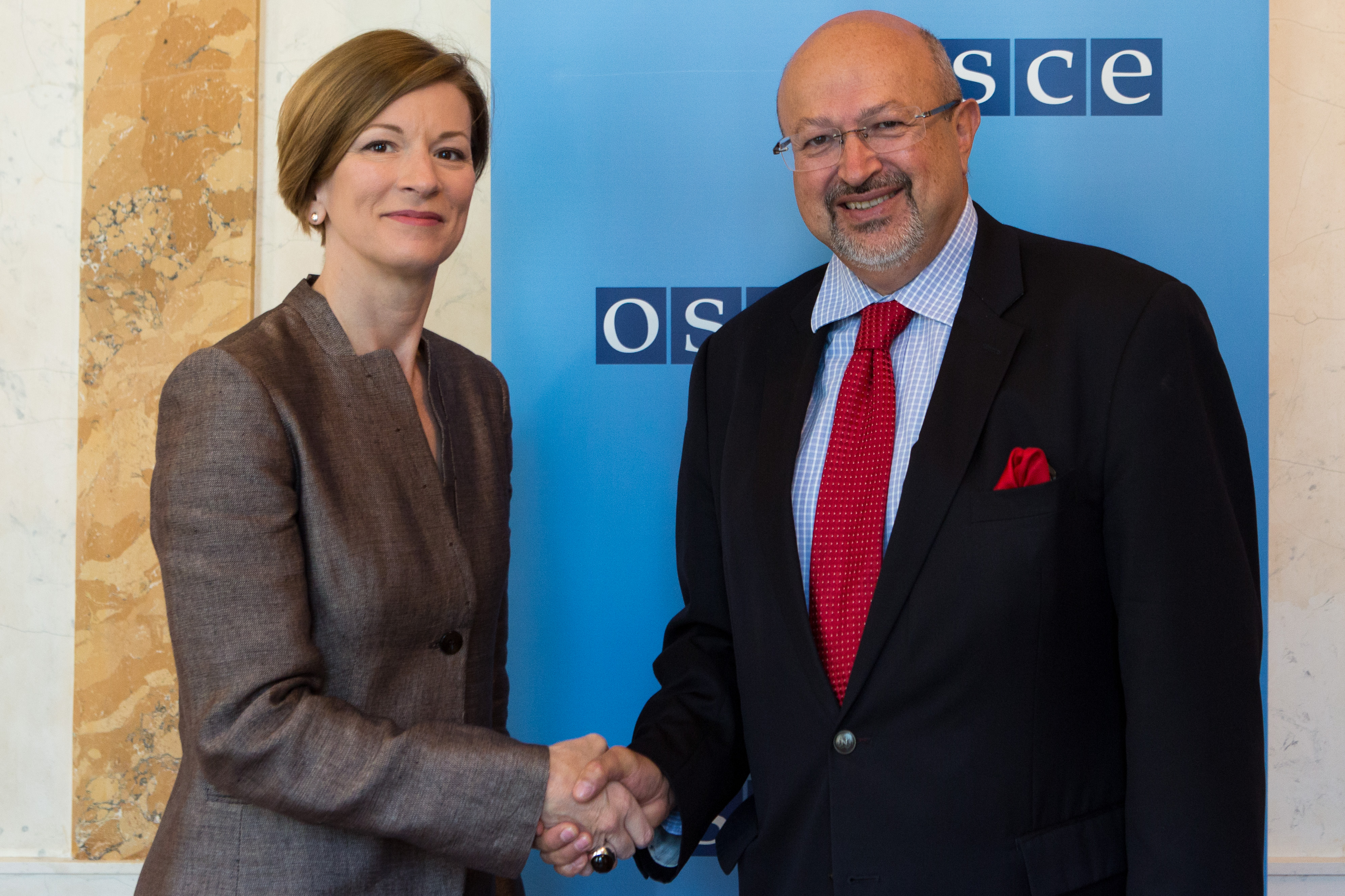 H.E. Ambassador Natascha Cayer (l), Delegation of Canada to the OSCE, with OSCE Secretary General Lamberto Zannier (r), Vienna, 23 August 2016.