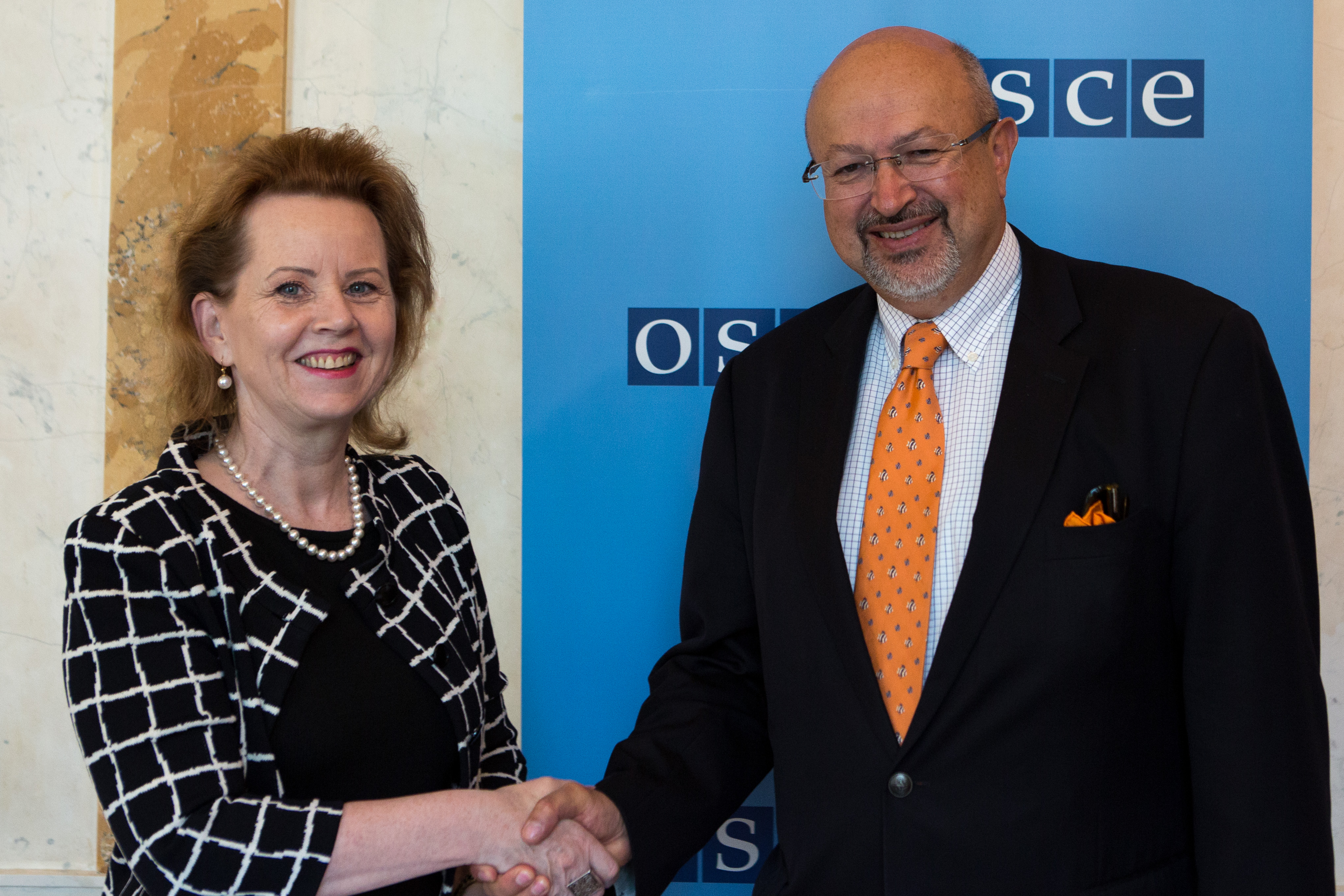 H.E. Ambassador Greta Gunnarsdottir (l), Permanent Mission of Iceland to the OSCE, with OSCE Secretary General Lamberto Zannier (r), Vienna, 24 August 2016.