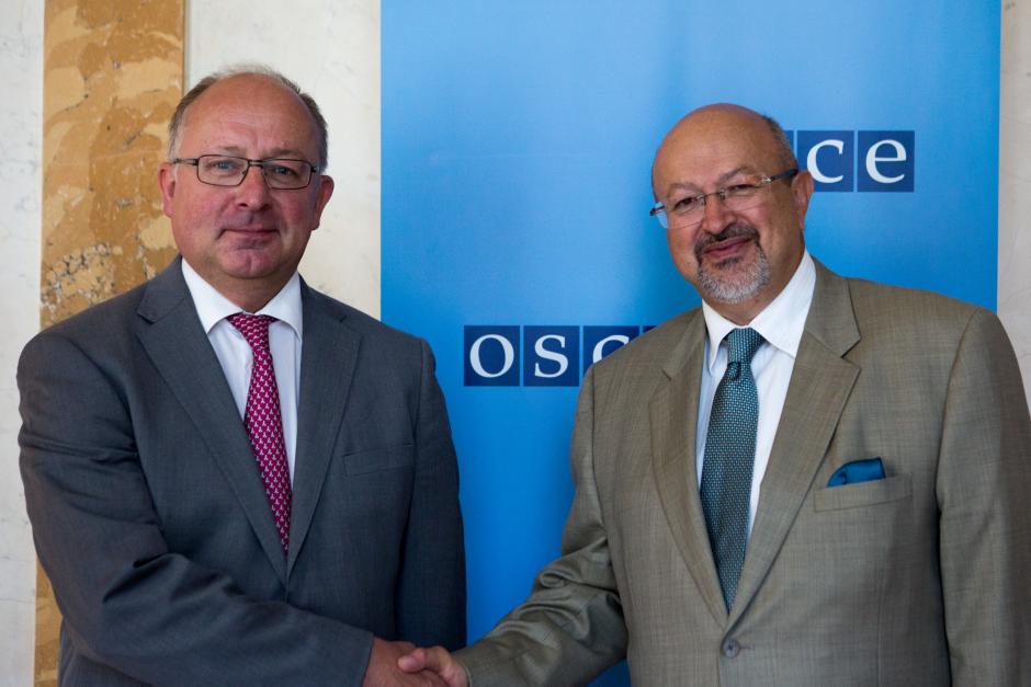 H.E. Ambassador Paul Huynen (l), Permanent Representation of Belgium to the OSCE, with OSCE Secretary General Lamberto Zannier (r), Vienna, 25 August 2016.