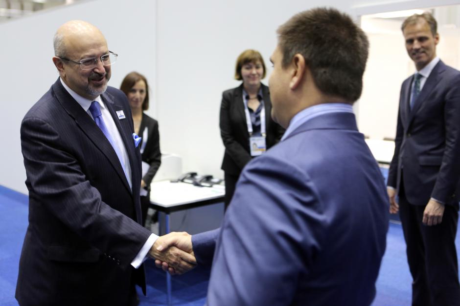 OSCE Secretary General Lamberto Zannier (l) meeting with the Minister of Foreign Affairs of Ukraine Pavlo Klimkin (c), on the margins of the 23rd OSCE Ministerial Council, Hamburg, 8 December 2016.