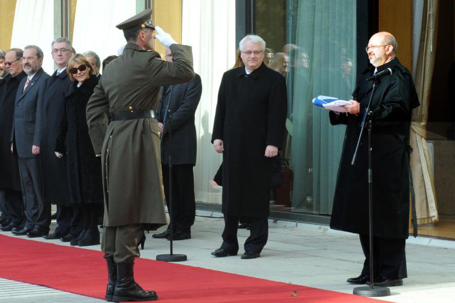 OSCE Secretary General Lamberto Zannier receives the OSCE flag during a ceremony to mark the closure of the Organization's office in Croatia, Zagreb, 17 January 2012.