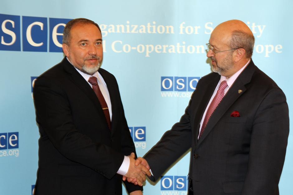 Israel's Deputy Prime Minister and Foreign Minister Avigdor Liberman (l) and OSCE Secretary General Lamberto Zannier, Vienna, 23 January 2012.