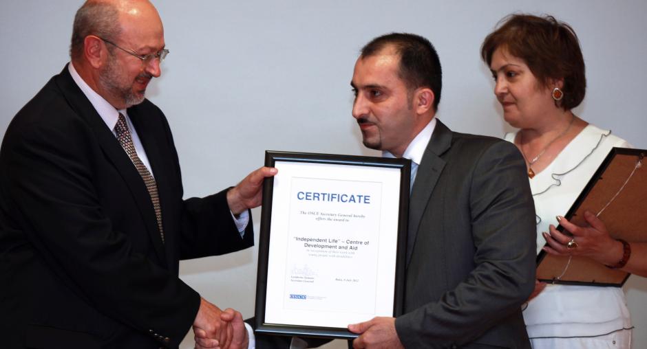 L-r: OSCE Secretary General Lamberto Zannier awards certificates to Aydin Khalilov, the Head of the Independent Life Centre for Development and Aid, and Valida Abbasova, the Head of the Mushvig Public Union, Baku, 9 July 2012. (OSCE/Zaur Zeynal) Photo details