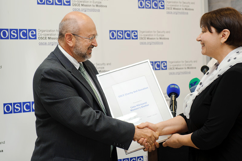 OSCE Secretary General Lamberto Zannier hands over a 2012 OSCE Charity Ball donation certificate to Elena Burca of the Casa Mărioarei women's shelter, Chisinau, 17 July 2012.