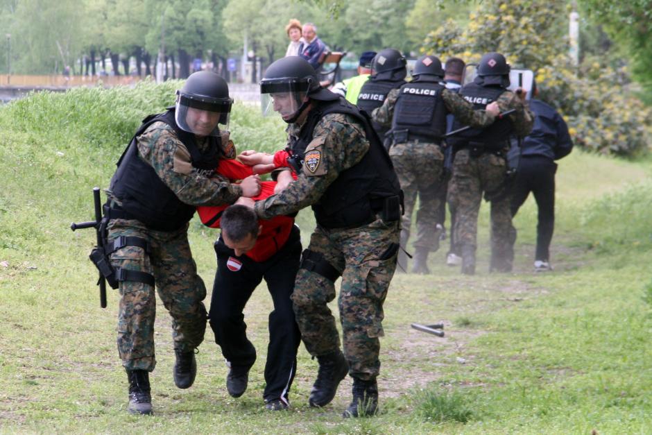 Police officers during a training exercise on isolating violent people from crowds, 19 April 2013.