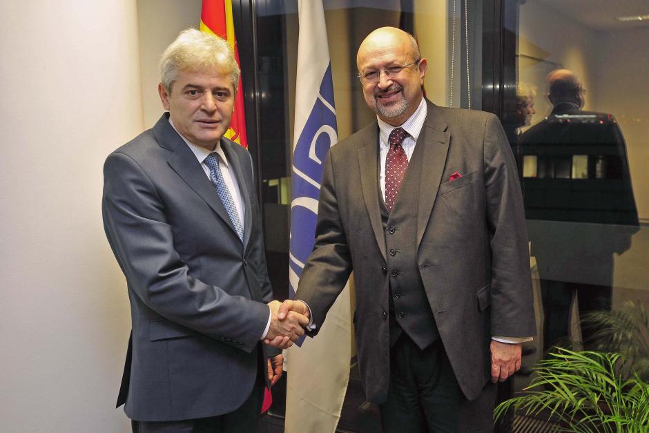 OSCE Secretary General Lamberto Zannier (r) shaking hand with the DUI leader Ali Ahmeti (l), Skopje, 30 November 2015.