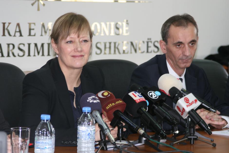 Head of OSCE Mission to Skopje Nina Suomalainen along the Minister of Education and Science Abdilaqim Ademi launching the Building Bridges Fund project, Skopje, 18 February 2016.