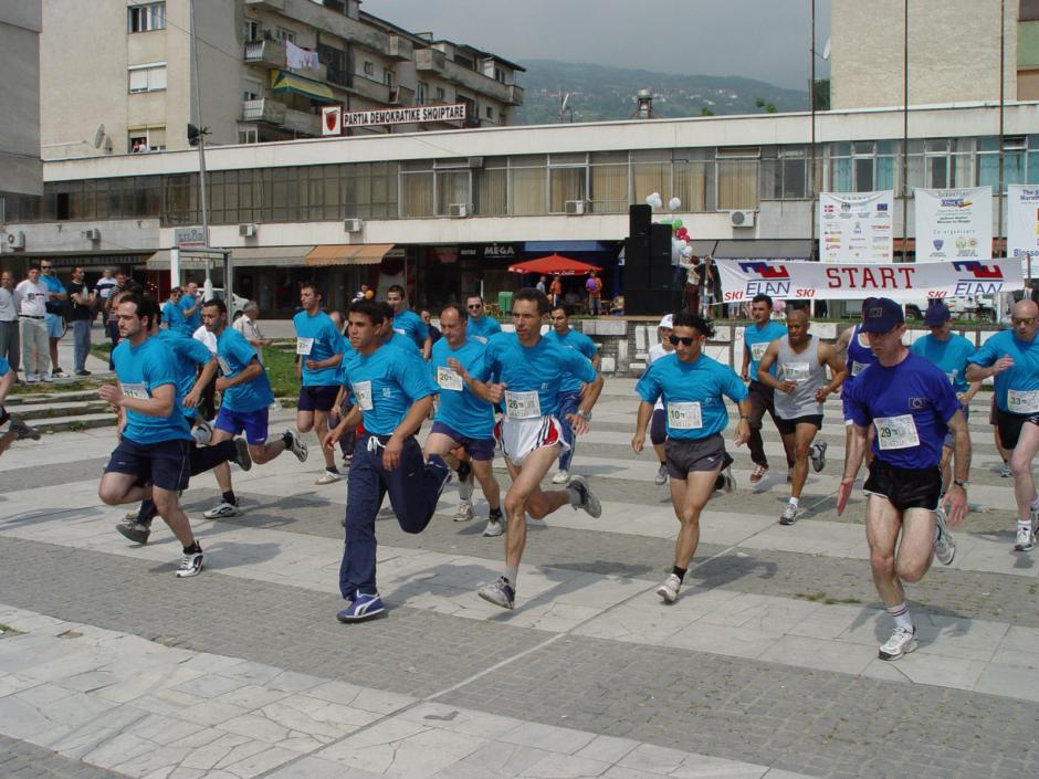 Participants at the seventh "Blossom Run", a traditional relay marathon race connecting Tetovo and Skopje, organized by the OSCE Mission to Skopje, 18 May 2003.