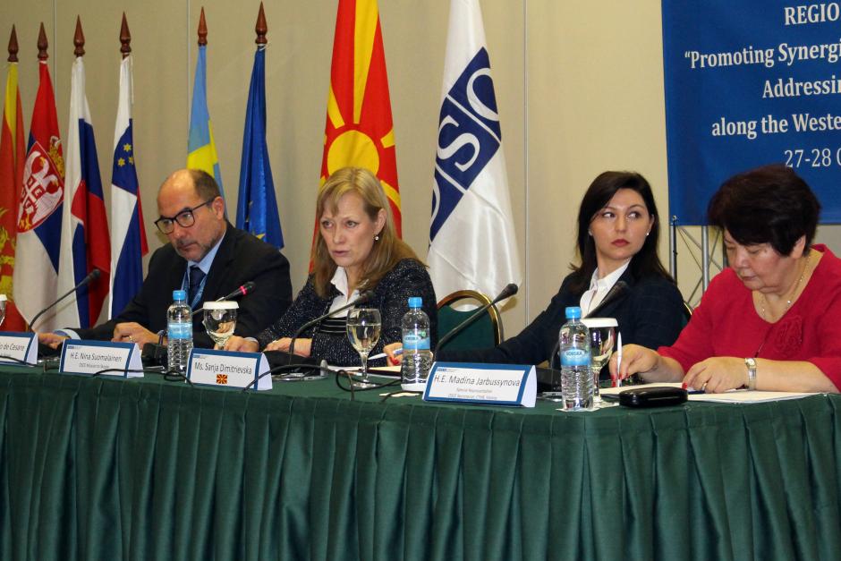Ambassador Nina Suomalainen, Head of the OSCE Mission to Skopje (c), speaking at the conference on addressing human trafficking along Western Balkan migration routes, Skopje, 27 October 2016.