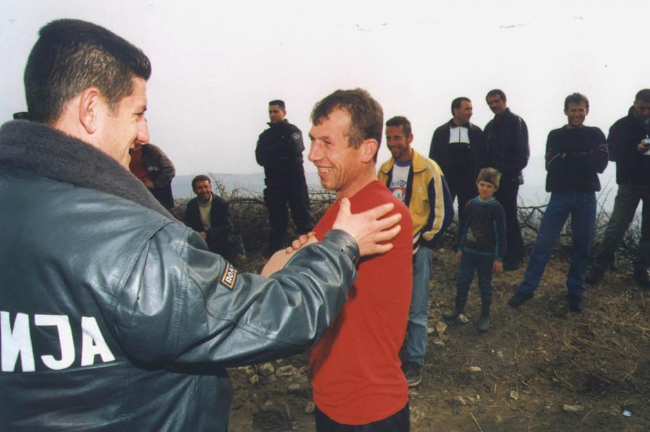 A policeman on patrol greets villagers in Gorno Mojanci, former