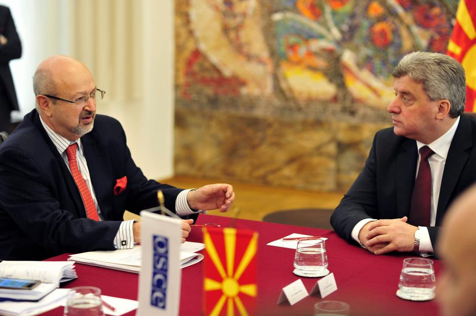 OSCE Secretary General Lamberto Zannier (l) during a meeting with President Gjorge Ivanov (r) while visiting Skopje, 9 March 2017.