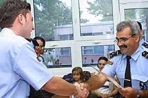 A police cadet who finished his three-month training course in Idrizovo receives his diploma, 30 July 2003.