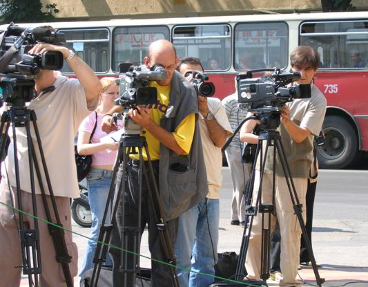 TV cameramen filming in Skopje, June 2005.