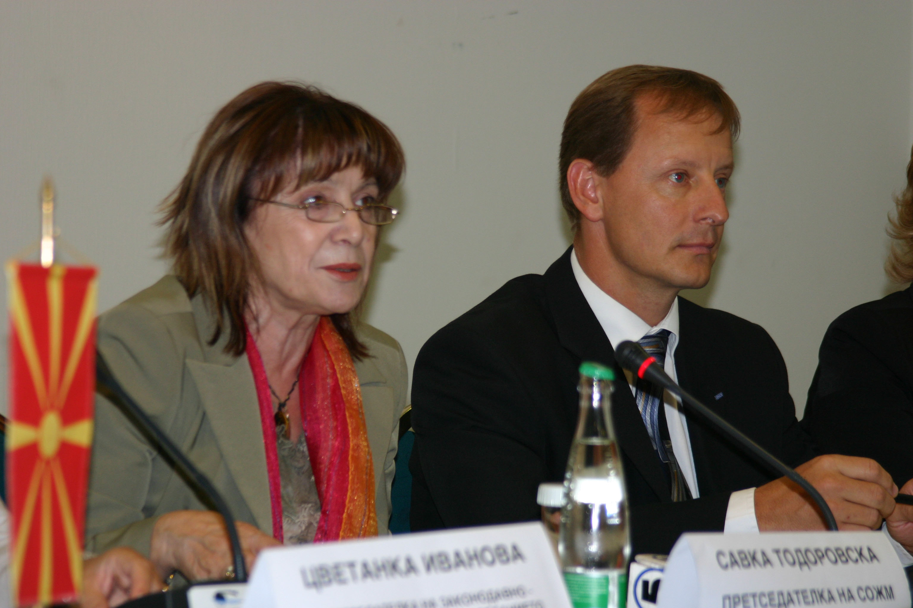 The President of the NGO Union of Women's Organizations, Savka Todorovska, and the Head of the Mission to Skopje's Rule of Law Unit, Victor Ullom, at the launch of a national project to promote gender equality, Skopje, 23 September 2005.