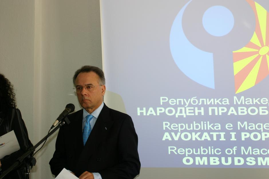 Head of the OSCE Mission to Skopje Carlos Pais talks to state officials, local journalists and the public at the opening ceremony of the Tetovo Regional Ombudsman Office, 19 October 2005.
