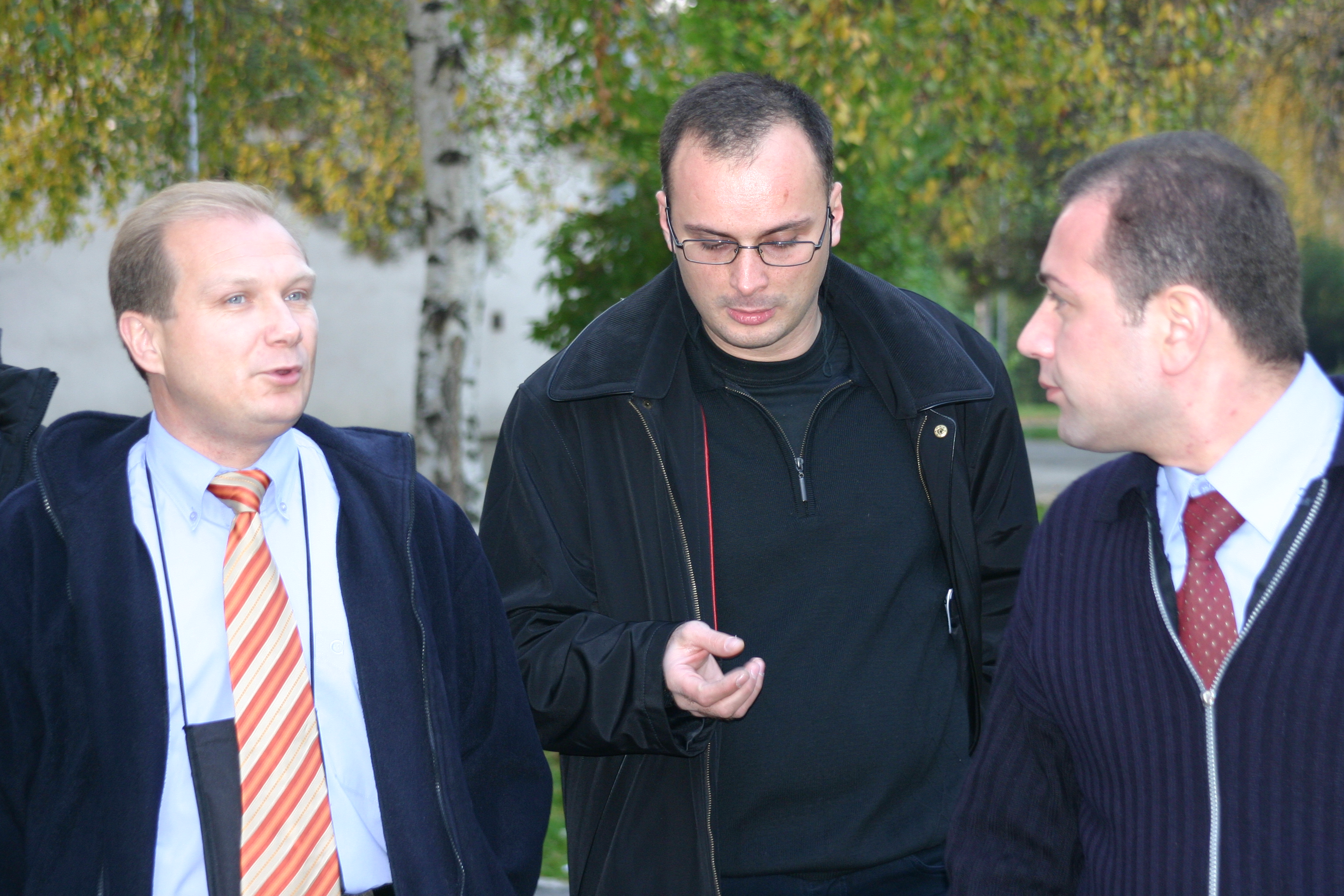 Yuriy Derevianchenko (left), a police instructor at the OSCE Mission to Skopje, with Georgian community police officers during their visit to the Police Academy near Skopje, 15 November 2005.