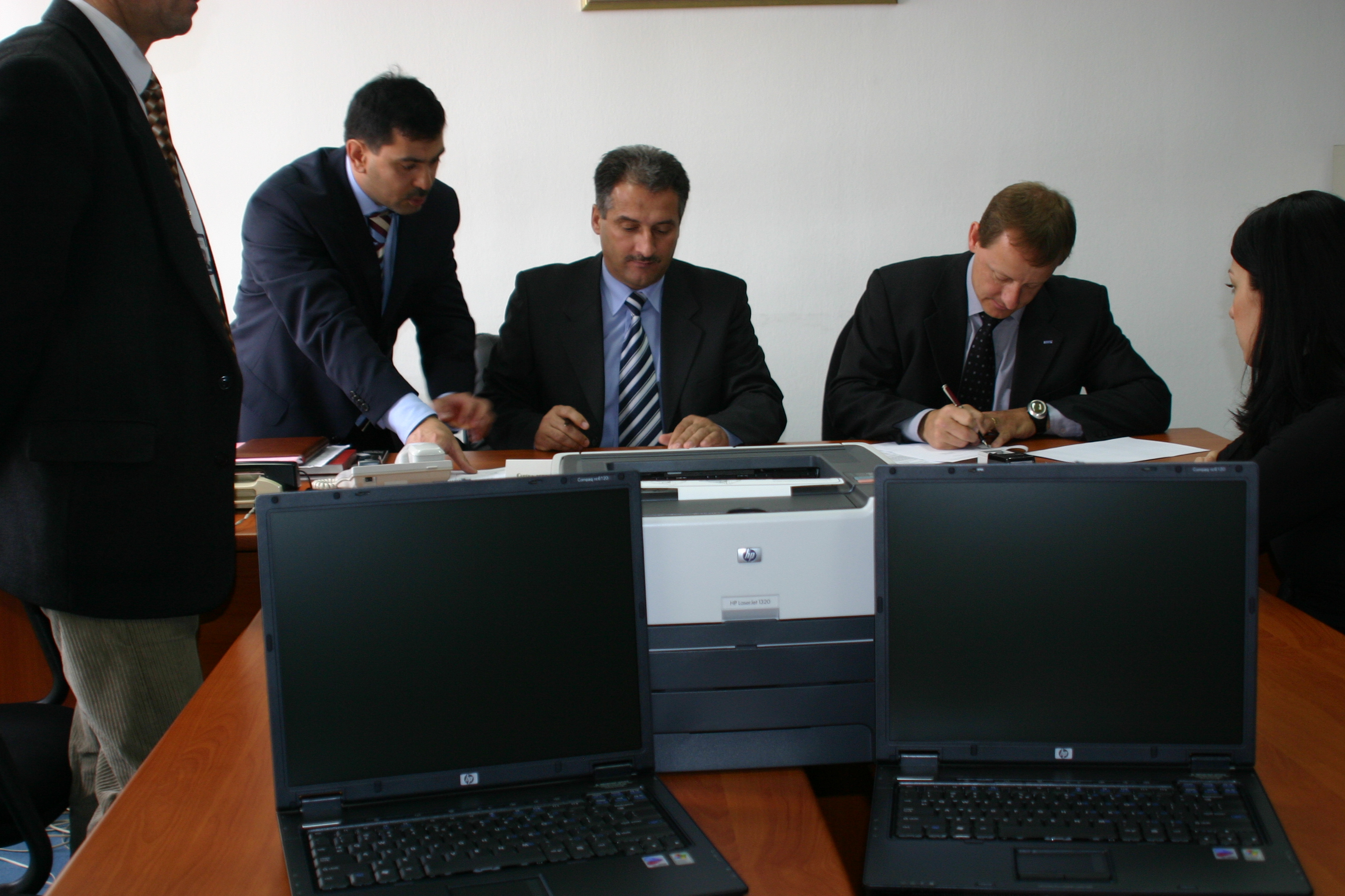 Victor Ullom (r), Head of the Mission to Skopje's Rule of Law Unit, with his Deputy Jovdat Mammedov (l) and Vasile Janevski, Head of the Ministry of Interior's Internal Control Unit (c) sign an accord donating IT equipment to the Ministry, 7 March 2006.