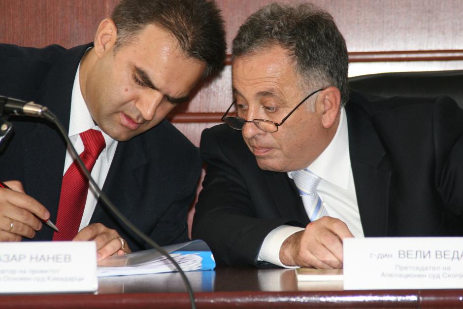 Lazar Nanev (left), President of the Kavadarci Basic Court and Head of the "Council for Prevention against Juvenile Delinquency" and Veli Vedat, President of the Skopje Appellate Court, discuss new court case assignment software, Skopje, 13 October 2006.
