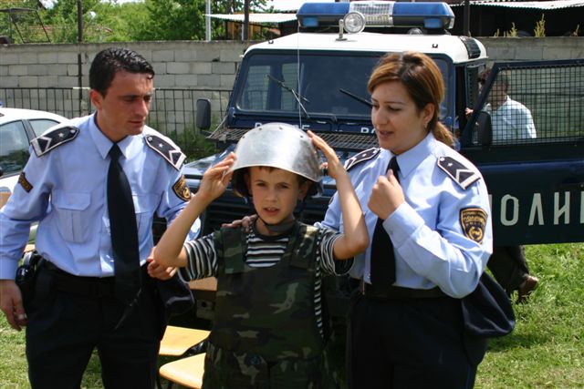 A boy tries on a police helmet at an event at Sv. Kliment Ohridski primary school in Chair municipality, Skopje, part of an OSCE Mission project on developing community safety, 14 May 2006.