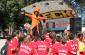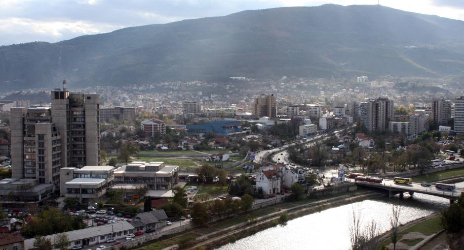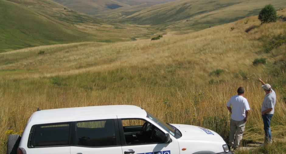 As part of an OSCE-supported outreach project, a police officer hands a brochure to a young boy in Skopje's Shuto Orizari municipality, 15 August 2011.
