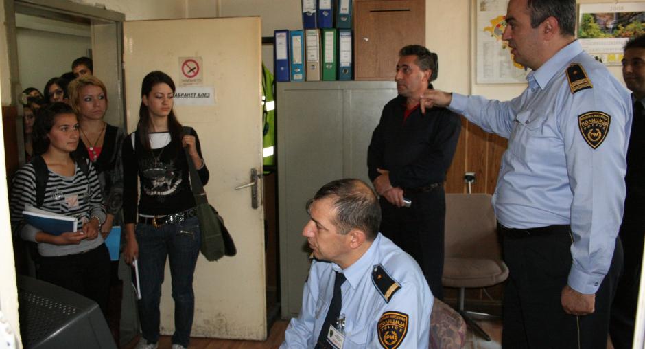 An inspector explains to secondary school students from Dimitar Vlahov school the work carried out in the operations room at the Strumica Police Station, Strumica, 24 October 2008. (OSCE/Attila Kulcsar)