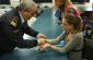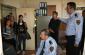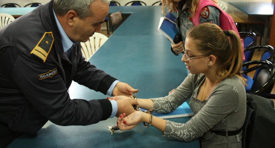 The Public Peace and Order Department Inspector from Strumica police station demonstrates the use of handcuffs to students from the Dimitar Vlahov school at a presentation on youth and crime, Strumica, 24 October 2008. (OSCE/Attila Kulcsar)