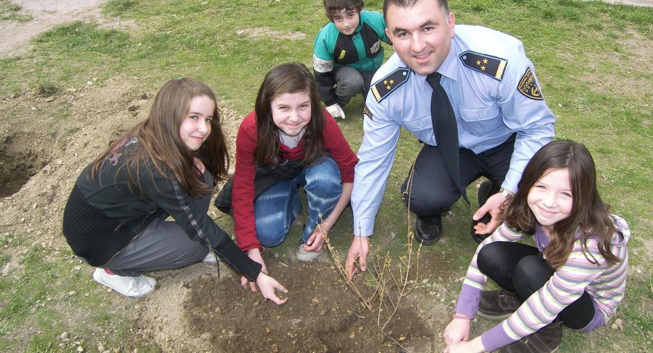 Police officer and children plant tree as part of the OSCE-supported project on confidence building between communities and the police, Skopje, 22 March 2010. (OSCE)
