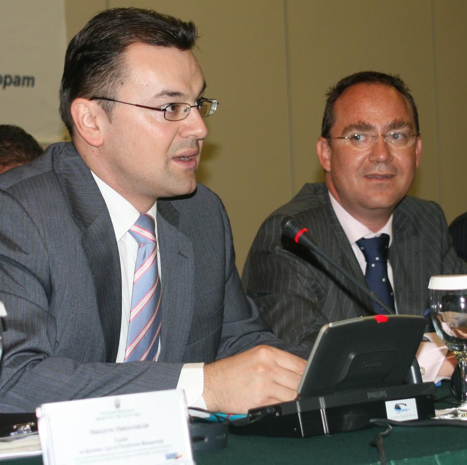 The Director of the State Administrative Inspectorate, Dimitar Georgievski (left) and the Head of the OSCE Mission to Skopje's Public Administration Reform Unit, Philip Stiel, at a conference in Skopje on improving public administration, 15 May 2007.