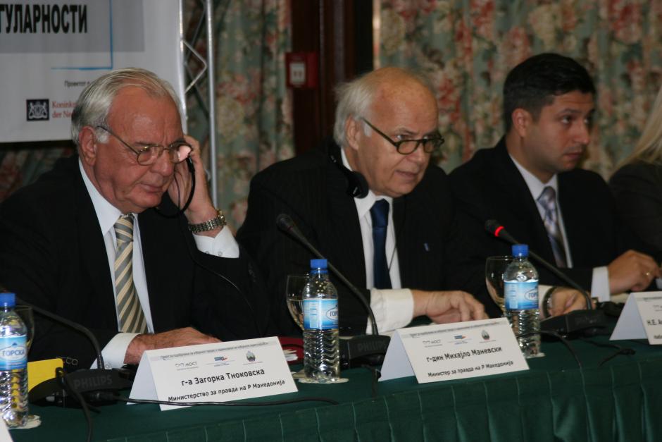 L-r: Minister of Justice Mihajlo Manevski; Head of the OSCE Mission to Skopje, Ambassador Giorgio Radicati and President of the NGO MOST, Darko Aleksov at a conference on improvements to the Electoral Code, Skopje, 17 December 2007.