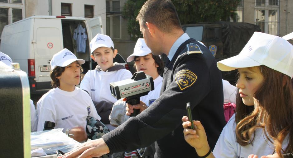 Schoolchildren were given a demonstration of policing equipment and a talk on the role of police officers, and how they work with police dogs. The children accompanied police officers on duty, learning about the importance of traffic rules. The children helped the police by handing out fliers with advice on traffic safety.