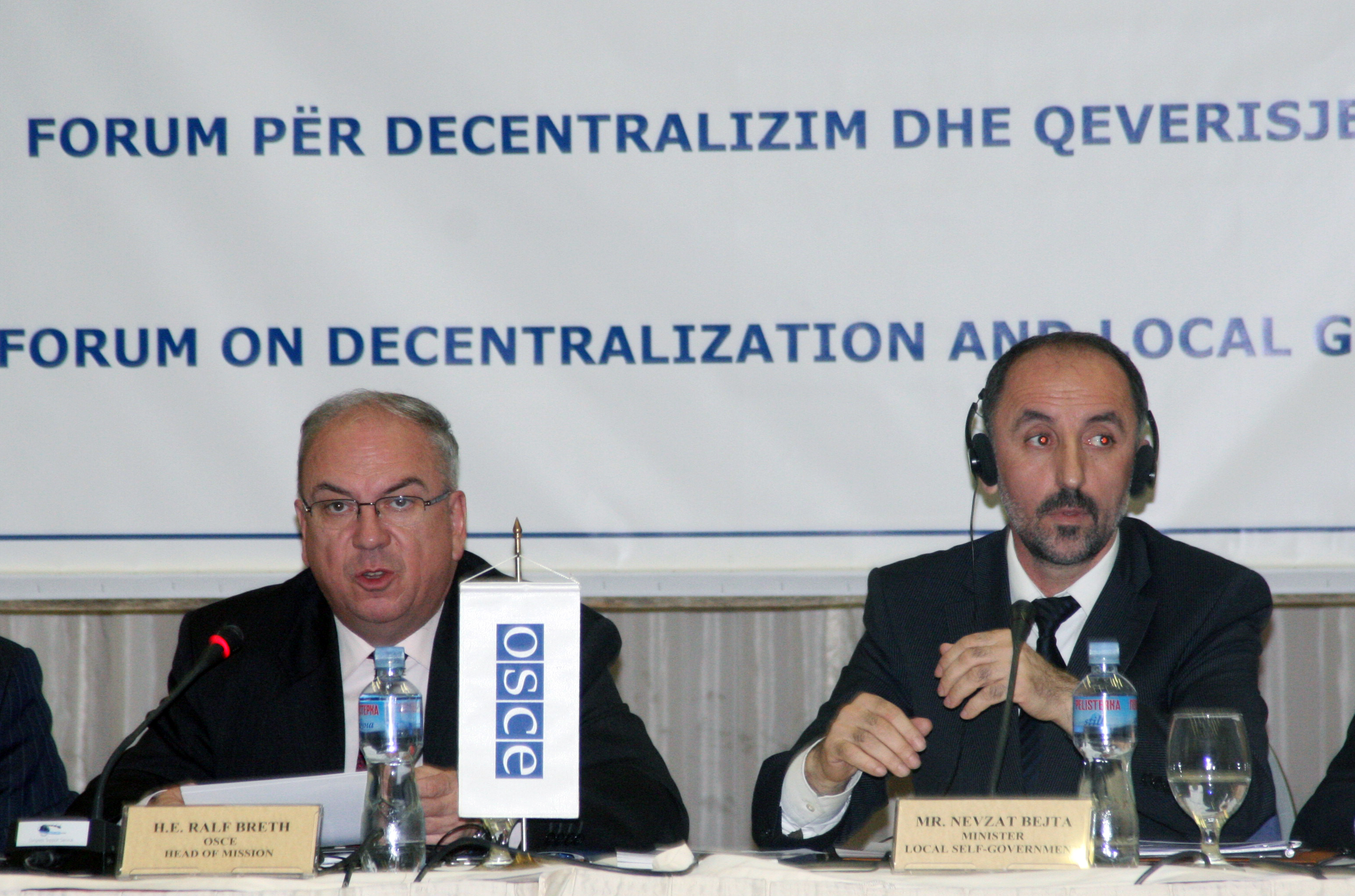 Head of the OSCE MIssion to Skopje Ralf Breth (l) and the Minsiter of Local Self-government Nevzat Bejta (r) present the Decentralization Assessment Report, Skopje, 1 February 2012.