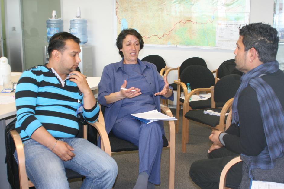 President of NGO Ambrela, Latifa Shikovska (m), holds a discussion with parents during the OSCE-supported workshop on how to better integrate Roma children within the education system, Skopje, 5 April 2012.