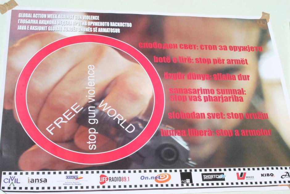 A poster for the campaign "Guns kill - kill guns", which started in Skopje on 2 June 2008, as part of the Global Week of Action against Gun Violence.