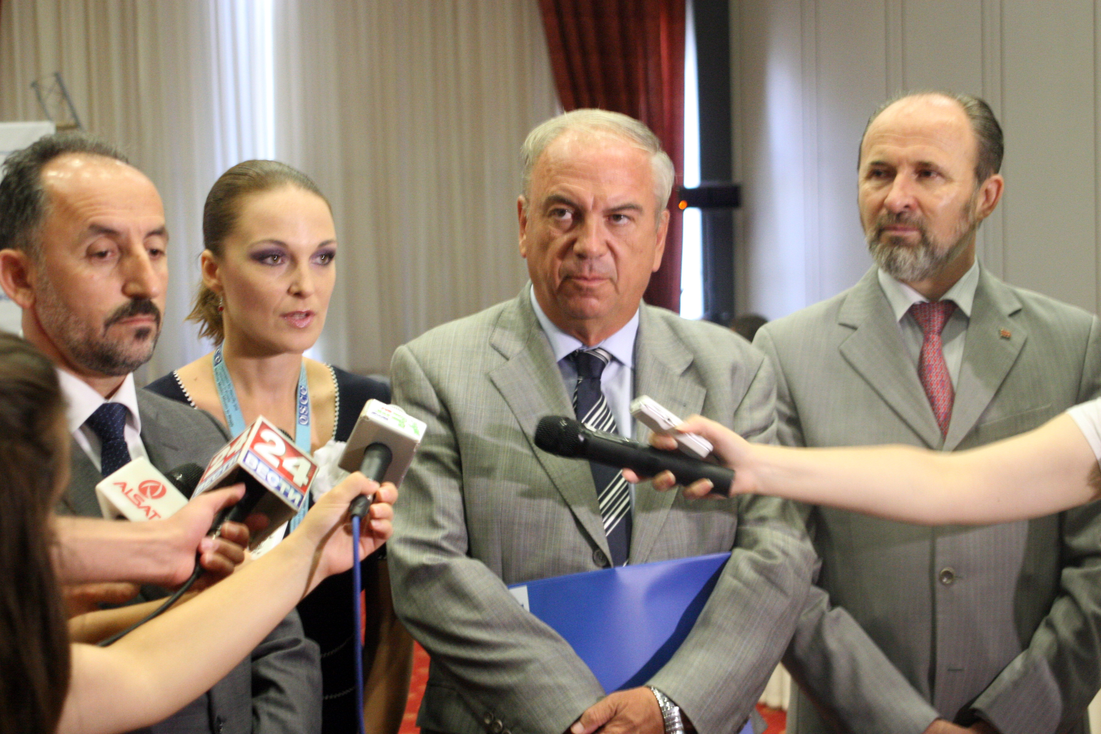 L-r: Minister of Local Self-Government Nevzat Bejta, OSCE Mission to Skopje National Public Administration Reform Officer Maja Subotic, the Head of the OSCE Mission to Skopje Ambassador Ralf Breth, and the President of the Association of Local Self-Government (ZELS) Koce Trajanovski, speaking to the media before a roundtable on Local Self-Government Capacity Building, Skopje, 18 July 2012.