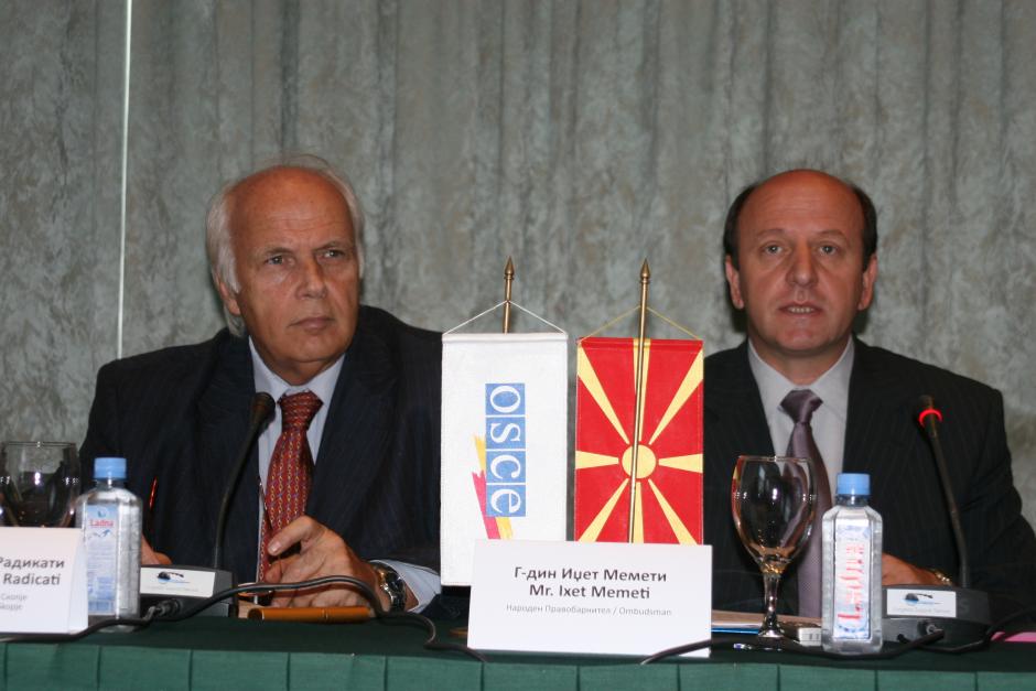 Head of the OSCE Mission to Skopje, Ambassador Giorgio Radicati (left), and National Ombudsman Ixhet Memeti at the launch of a public campaign aimed at raising awareness of the role and functions of the Ombudsman, Skopje, 9 September 2008.