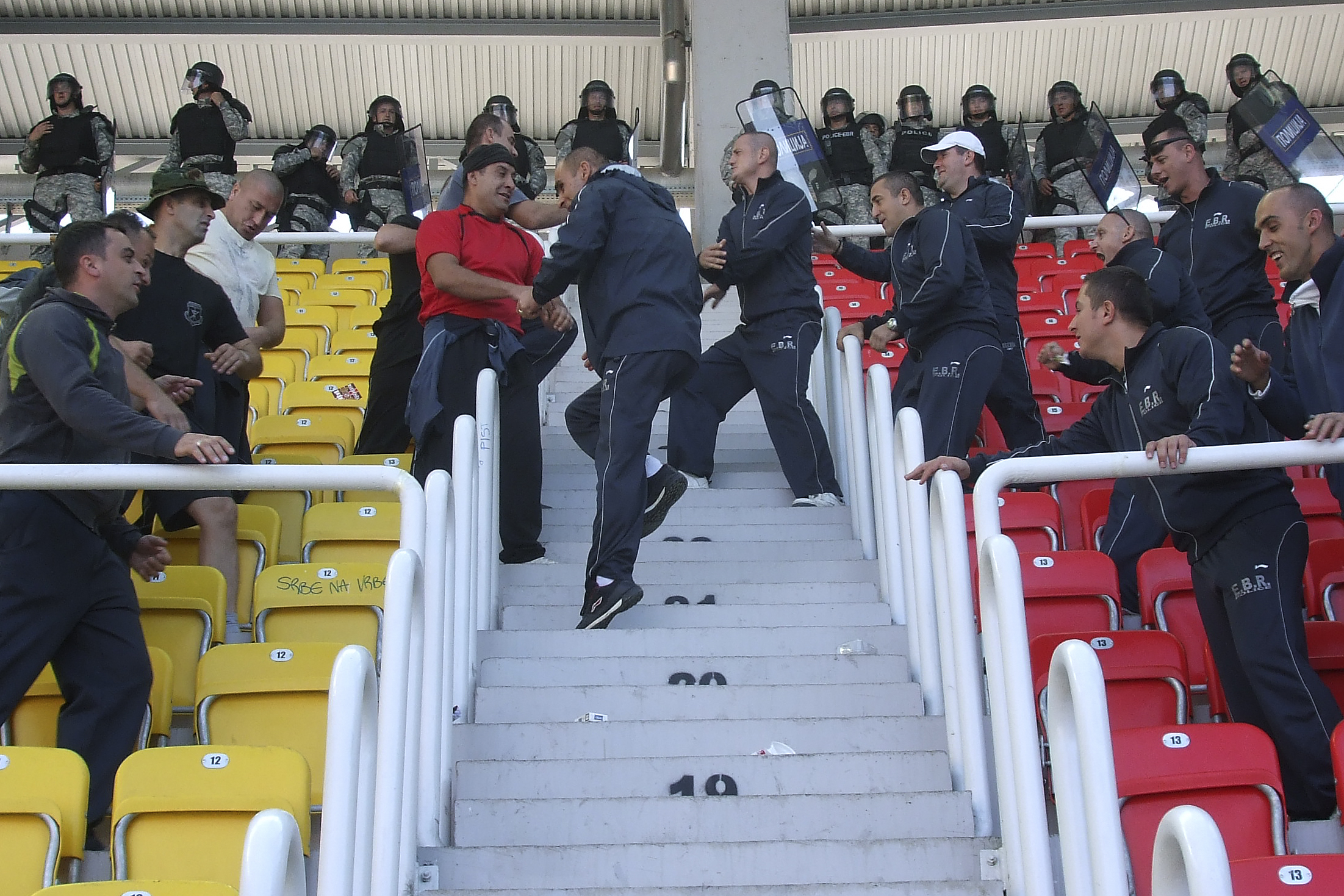Officers from the national police's rapid-deployment unit take part in an OSCE-supported training exercise on the use of peaceful crowd-control techniques during public events, Skopje, 15-19 October 2012.