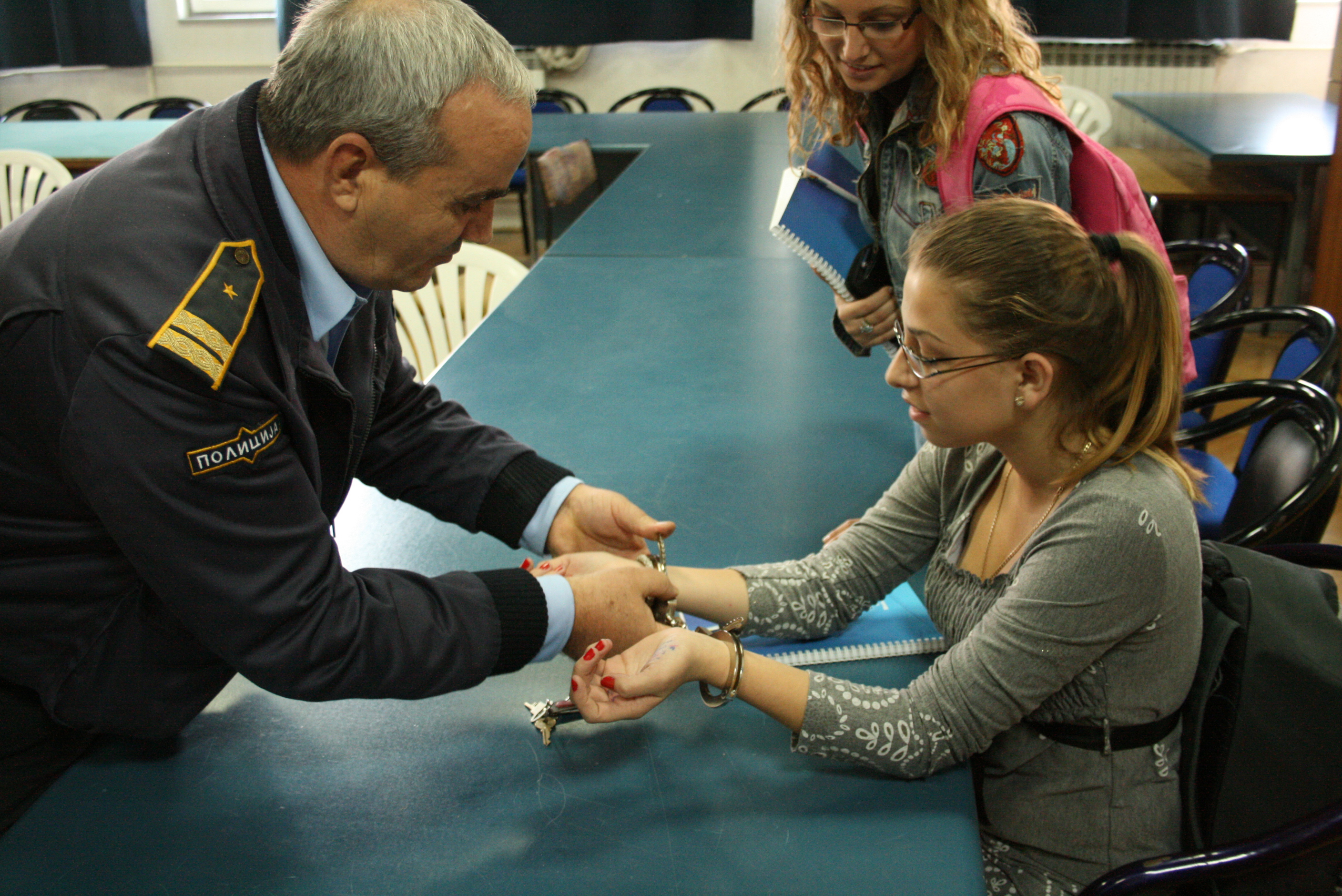 The Public Peace and Order Department Inspector from Strumica police station demonstrates the use of handcuffs to students from the Dimitar Vlahov school at a presentation on youth and crime, Strumica, 24 October 2008.