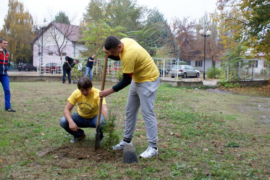Students from the 8th September Secondary School in Skopje plant a tree in the schoolyard, as part of an OSCE-supported project on safe schools, Skopje, 7 November 2012.