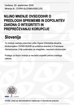 Slovenija: NUJNO MNENJE OVSE/ODIHR O PREDLOGIH SPREMEMB IN DOPOLNITEV ZAKONA O INTEGRITETI IN PREPREČEVANJU KORUPCIJE