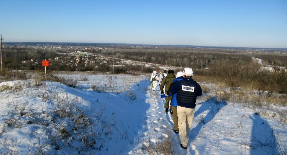 SMM members assess the possible presence of mines/unexploded ordnance (UXO) together with the Joint Centre for Control and Co-ordination (JCCC) in eastern Ukraine, 31 January 2017.