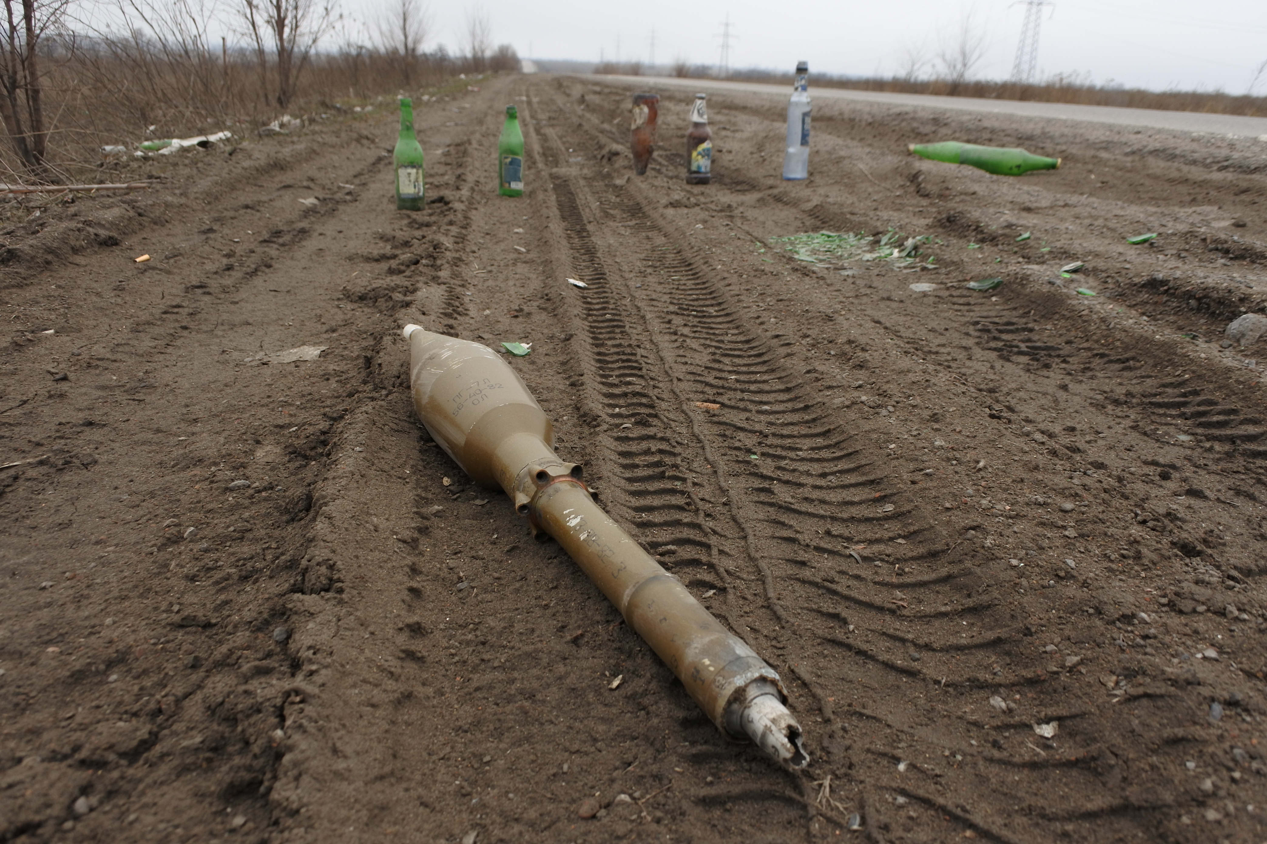 An unexploded PG-7L grenade lies by the side of the road in the grey zone separating the armed parties. The bottles were placed there by locals to alert drivers to the presence of the UXO as emergency services are not able to operate in the zone, 7 March 2017.