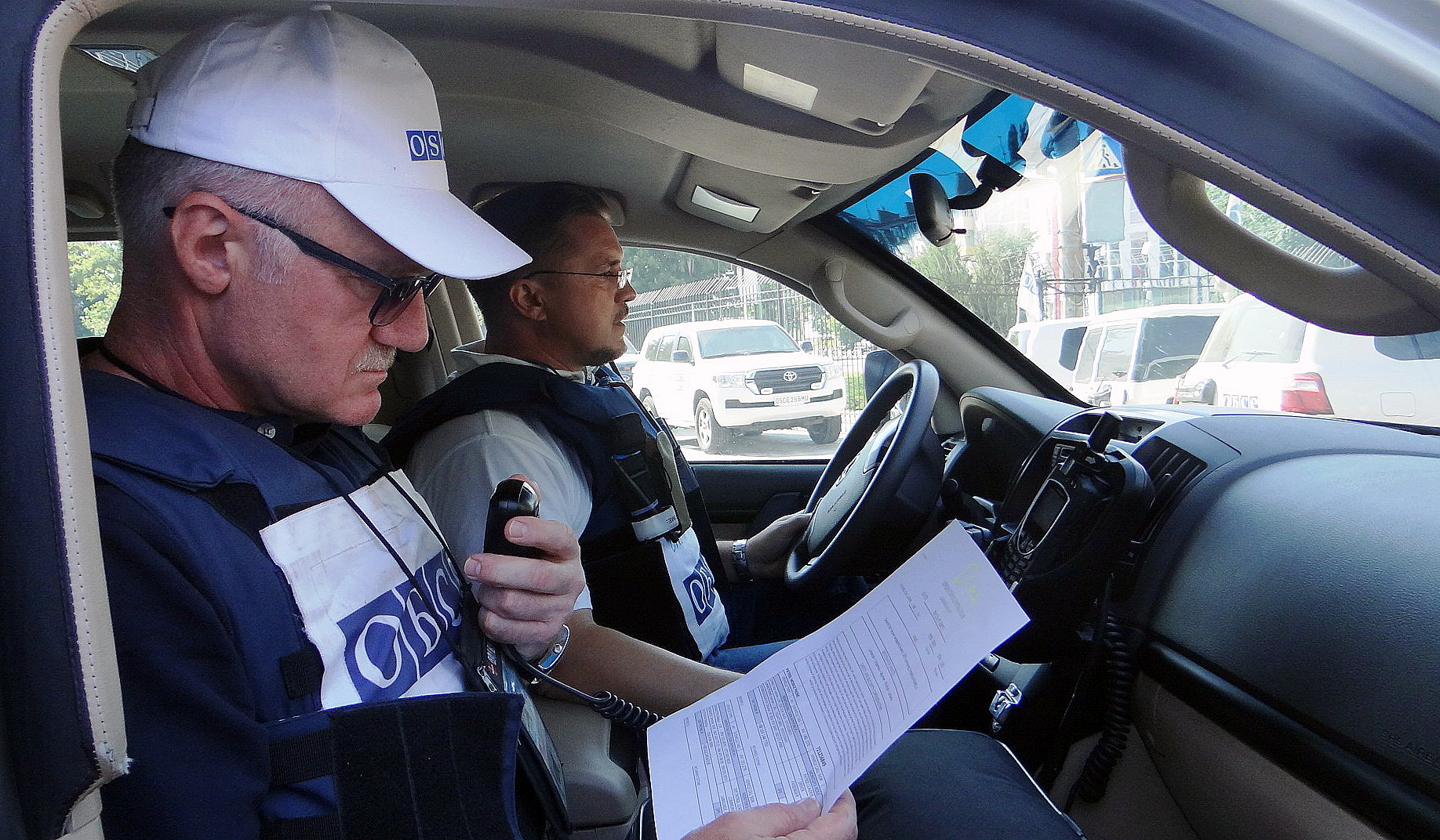 Monitoring Officers Dmitry Komarov and Nikolai Dranitsyn test their communications equipment before starting a patrol in Luhansk 21 July 2017.