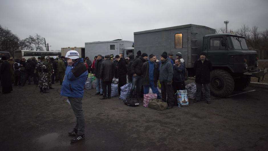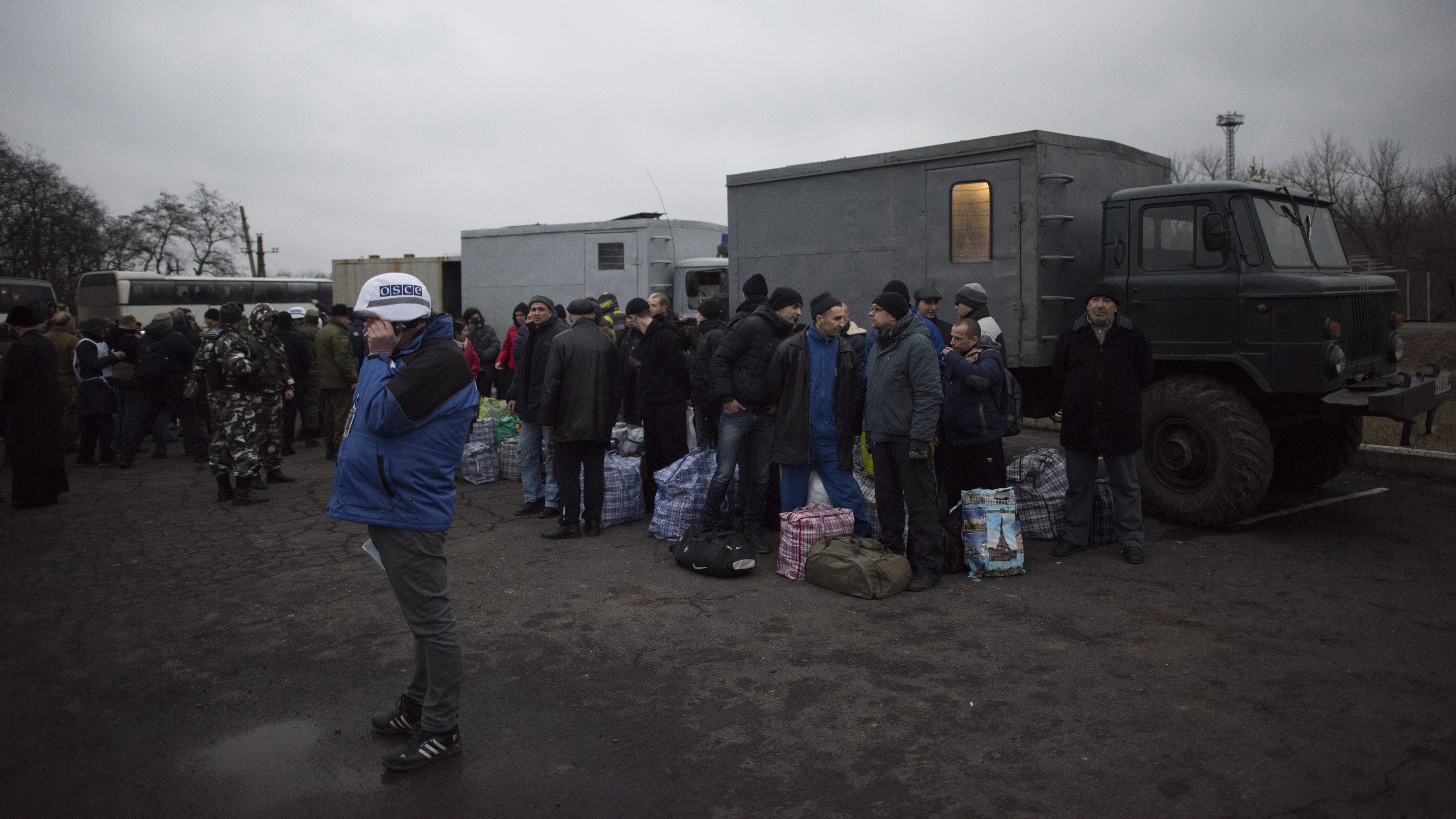 Members of the OSCE Special Monitoring Mission to Ukraine monitoring the security situation around the exchange of detainees across contact line at Maiorsk entry-exit check point, 27 December 2017.