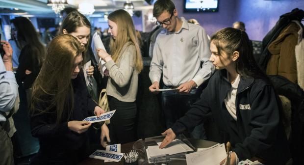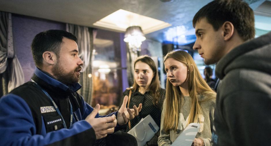 It was a cold February evening in Luhansk city; inside, the room was filled to capacity. Students, teachers and other curious residents of this town had accepted the open invitation of the OSCE Special Monitoring Mission in Ukraine (SMM) to join Principal Deputy Chief Monitor Alexander Hug and other monitoring officers for an informal public discussion on what the SMM does.